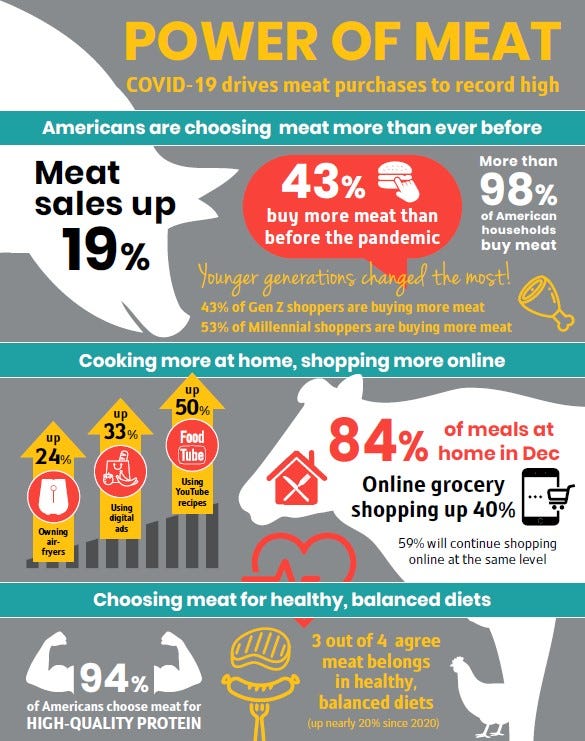 Nearly all American households (98.4%) purchased meat in 2020 (IRI), and 43% now buy more meat than prior to the pandemic – primarily because they are making more meals at home.