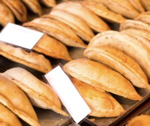 The machine processes raw and cooked ingredients while maintaining the firmness of granular fillings – such as peas, corn kernels, and diced potatoes – up to 10mm. After production, each empanada is labeled with stamped words like “beef” or “chicken” to indicate its filling.