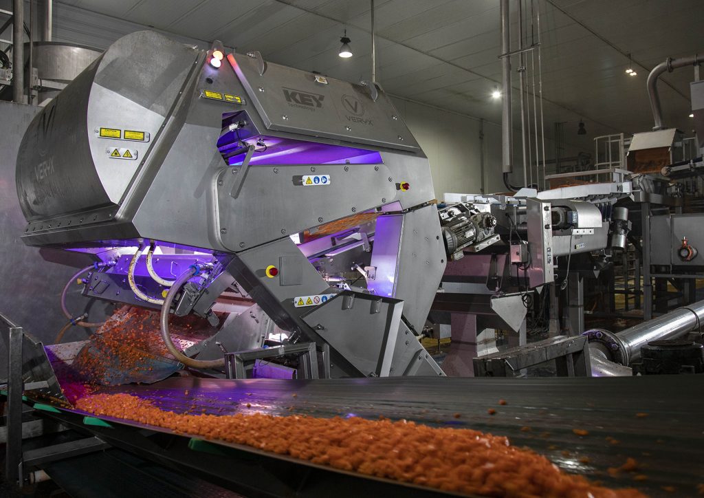 In 2017, Key installed its most advanced digital sorter, the VERYX, to remove foreign material (FM) and defects from product prior to blanching at the Ychoux plant. In 2019, another unit was added immediately prior to the packaging line. Now, with two VERYX sorters on one production line, efficiency is maximized and food safety is elevated.