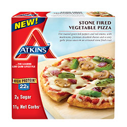 Atkins new Stone Fired Vegetable Pizza is topped with green bell peppers, red onions, mushrooms, shredded cheeses and garlic sauce.The varieties are: