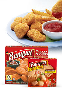 The Banquet brand of frozen products runs the gamut from single- and family-serve entrees, pot pies and fruit pies to snacks, breakfast sausage and prepared chicken. Among its offerings are Salisbury Steak with Mashed Potatoes, Mac & Cheese Bites, Fettuccini Alfredo, Turkey and Gravy, Chicken Nuggets and Fries, and Loaded Potato Bites.