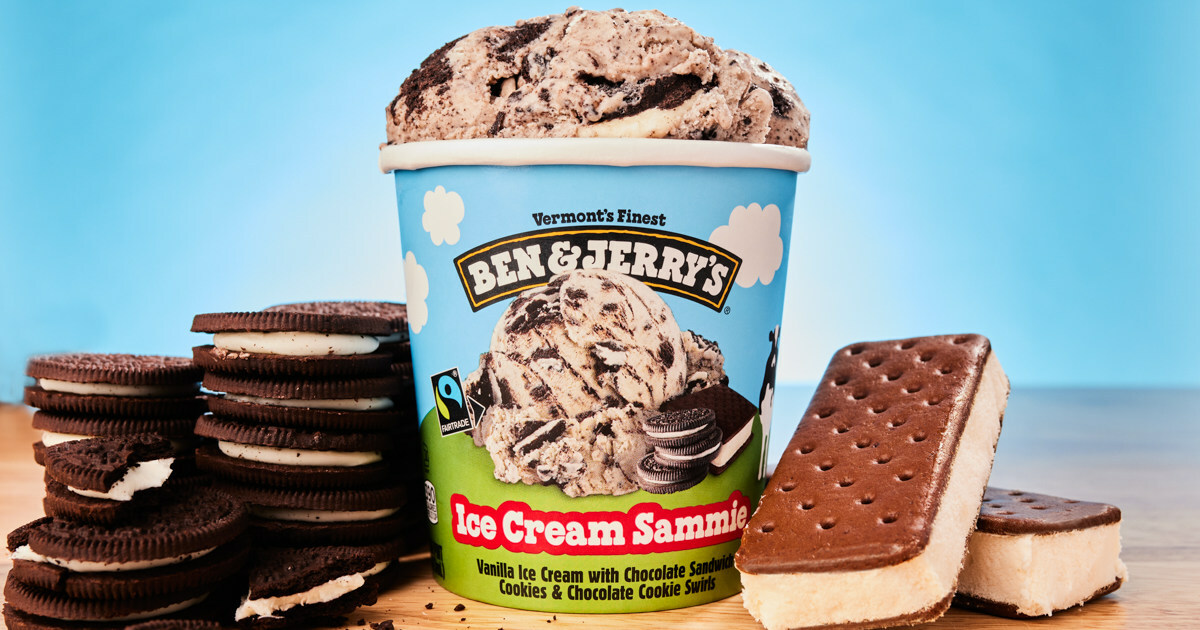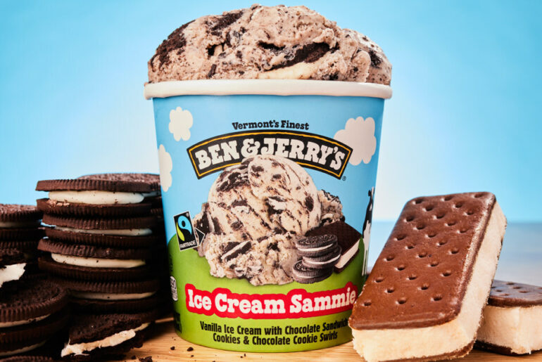 Ice Cream Sammie, Ben & Jerry’s newest limited batch flavor, is being nostalgically promoted to Americans in the United States as “a sure thing to bring you back to simpler times spent sipping from the hose, mowing lawns for money and summer skies full of stars.”