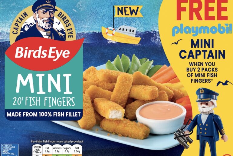 In a campaign to drive excitement of the debut and engage with the target audience, Birds Eye is teaming up with the popular Playmobil brand. The partnership includes an on-pack promotion that will gift a special edition bespoke Captain Birds Eye Playmobil character with the purchase of two packs of Mini Fish Fingers. Set to kick off on April 1 and run through June 30, the promotuib will be supported by an in-store shopper activation campaign across multiple retailers. In addition, a £2.6 million media blitz will begin in mid-April, which will include a TVC, PR, social and OOH advertising.