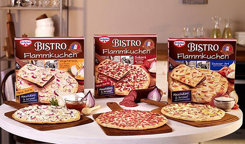 Bielefeld, Germany-headquartered Dr. Oetker is out with two variations of  its Bistro Alsatian-style Flammkuchen. It has added Bistro Salami, with crème fraîche and red onions, and Bistro Vegetarisch, with crème fraîche, mild goat cheese, red onions, honey and rosemary. The pizza-like French specialty, with a crisp, irregular base, is suggested for retail at 2.59 euros.