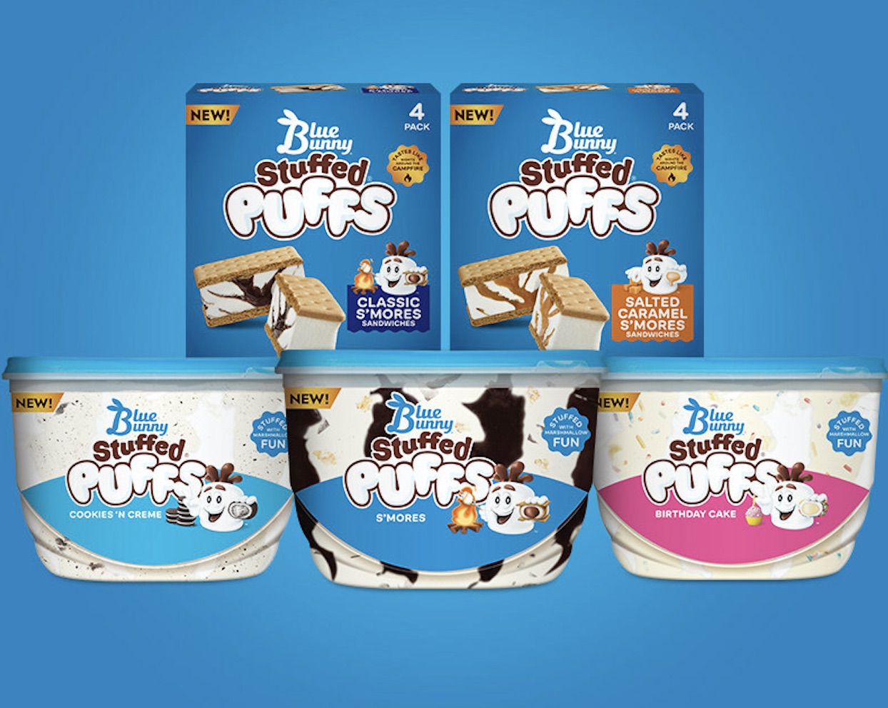 “We are thrilled to be partnering with Stuffed Puffs Filled Marshmallows and believe that the playful indulgence of our frozen treats combined with their mission to promote more fun-filled lives is a match made in confectionery heaven,” said Jeremy Hrynewycz, Blue Bunny’s brand marketing director. “These disruptive innovations are the first of their kind in delivering a filled marshmallow experience in multiple frozen forms.”