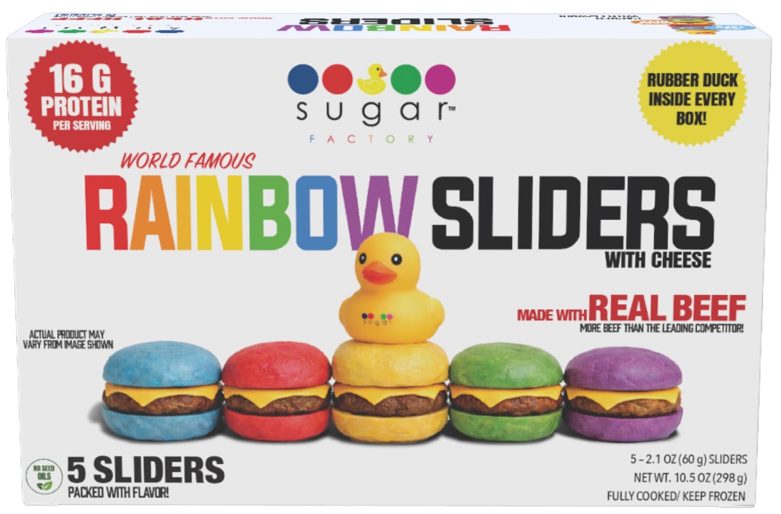 Rainbow Sliders feature fully cooked 0.8 oz beef patties nestled in vibrant colored buns, a visual signature that colorfully sets them apart in the frozen food section of supermarkets. Made with no seed oils and delivering up to 16 grams of protein per serving, the product is distributed in 5-pack and 10-pack formats designed for quick preparation straight from the freezer.