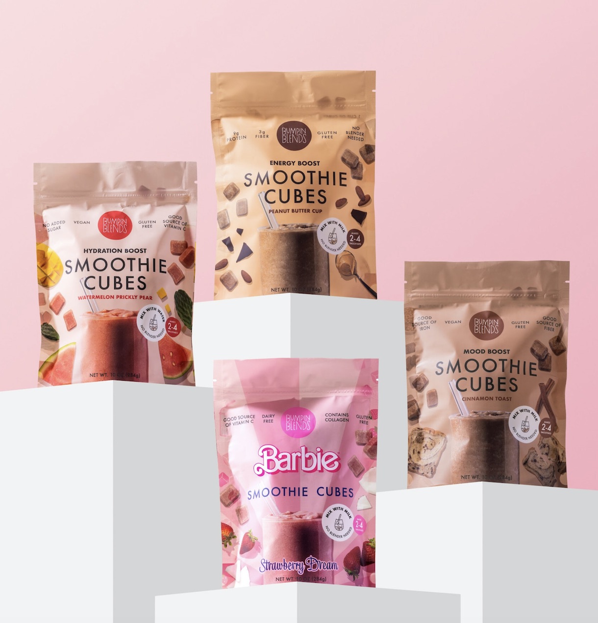 Shoppers can purchase the smoothie cubes in four flavors priced between $7 and $9: Watermelon Prickly Pear (designed for hydration), Bumpin Blends x Barbie Strawberry Dream (skin), Cinnamon Toast (mood) and Peanut Butter Cup (energy) . Retailing for $7-9, Bumpin Blends can be found in the freezer aisles at local Targets, Walmarts, and Sprouts.