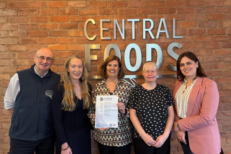 Northamptonshire, England-based Central Foods has achieved AA-grade BRCGS Agents & Brokers certification for the ninth consecutive year. Celebrating the occasion above are members of the technical team (left to right): Christopher Stobart, Heidi Willington, Karen Wright, Shelley Duncan and Anna Ciszewska.