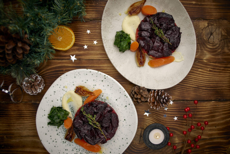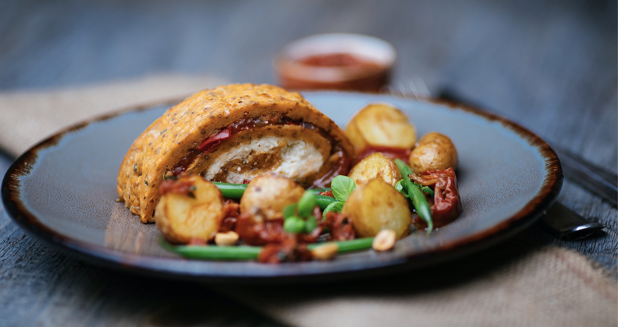 “Our vegan options that are popular at Christmas include the Menuserve beetroot and thyme tarte tatin (pictured at top of story) and the Menuserve Cajun spiced sweet potato roulade (seen below),” said Gordon Lauder, managing director of Northamptonshire, England-based frozen food distributor Central Foods. “Traditional favorites remain most popular at Christmas, but the rise in veganism and flexitarianism means that there’s growth in this area across all day parts – from breakfast and snacks to main courses and desserts.”