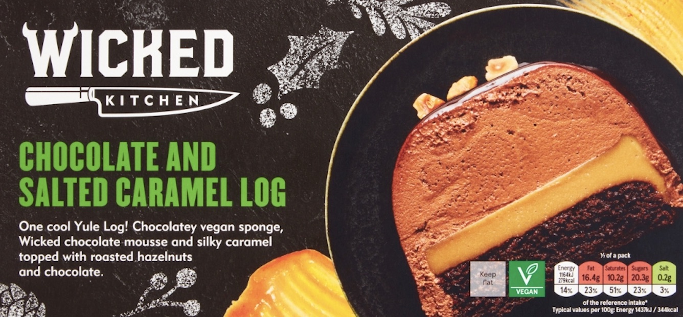 Tesco’s Wicked Kitchen range of plant-based products now includes Mini Mac Party Pots, a No-Turkey Roast Crown, Chocolate and Salted Caramel Cake made with soya and beetroot, and a Chocolate and Salted Caramel Log (pictured below) made especially to be enjoyed during the Yuletide season.