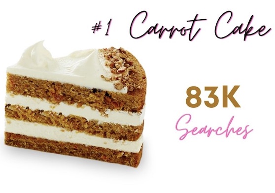 Ranking No. 4 is Chocolate Cake with 383,000 searches, while Red Velvet Cake comes in fifth with 342,000 clicks. Next in sixth place is Lemon Cake with 88,000 searches, followed by seasonal superstar Christmas Cake with 82,000 searches.