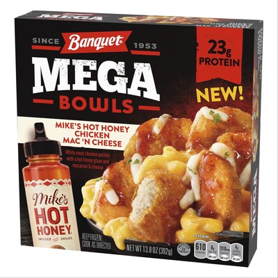 Inspired by top quick service restaurant menu offerings, Mike’s Hot Honey has teamed up with Banquet on new MEGA Bowls Mike’s Hot Honey Chicken Mac ‘N Cheese. This hot, sweet and savory single-serve meal features white meat chicken patties with a hot honey glaze, and macaroni & cheese. The 13.8 oz. meal delivers 23 grams of protein with a suggested retail price of $3.49.