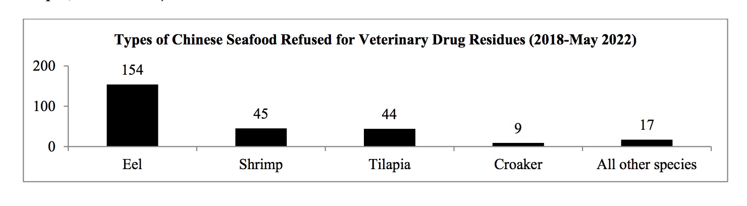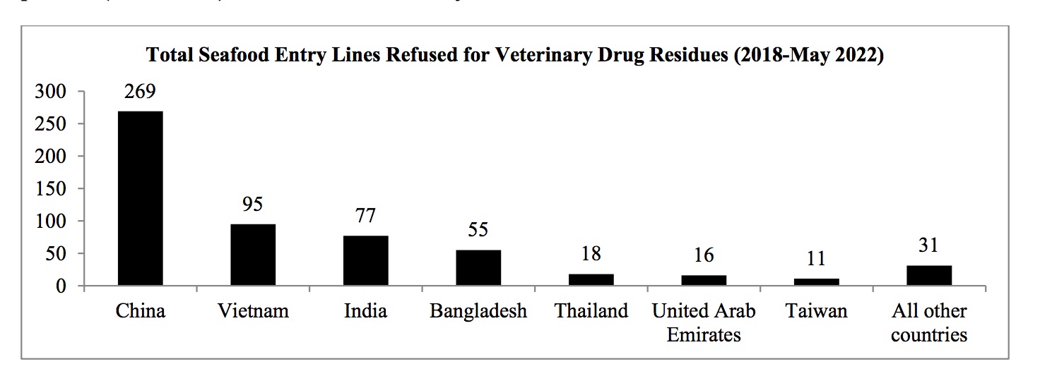 Even with the large reduction in Chinese seafood exports to the United States since 2018, the PRC’s share of overall seafood import entry line refusals for reasons related to the presence of veterinary drug residues has increased to over 47 percent. As shown in the table below, China has accounted for 269 of the 572 entry lines refused by the FDA for banned antibiotics since 2018, far and away the largest single source for these refusals.