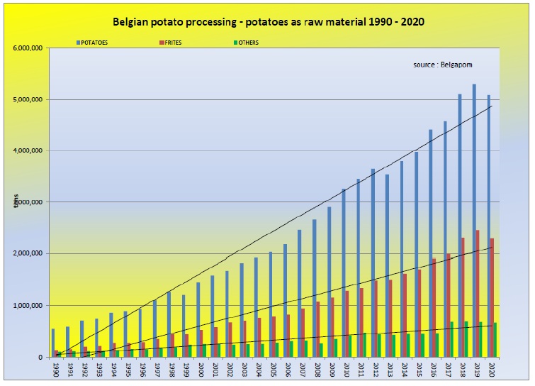 Figures recently published by Belgapom, the Belgian potato trade and processing industry association, chart the negative impact of the novel coronavirus (SARS-CoV-2) pandemic on the sector. Only 5.08 million tons of tubers were processed into fries, mashed potato products, crisps and flakes in 2020. That equates to a decrease of 4% compared to 2019, as the production level fell to its lowest point in three years.