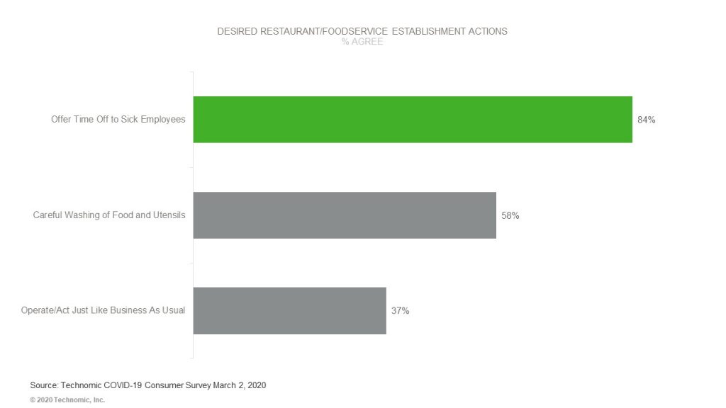 In Technomic’s research, consumers provided their opinions on how the restaurant industry should respond to the coronavirus situation. The top two responses cover mitigating the spread of the virus by providing necessary employees with time off and following proper sanitation procedures. Interestingly, 37% say that restaurants should operate “business as usual.” This indicates that many consumers are satisfied that foodservice operators are as prepared as anyone to mitigate the impact of an outbreak.