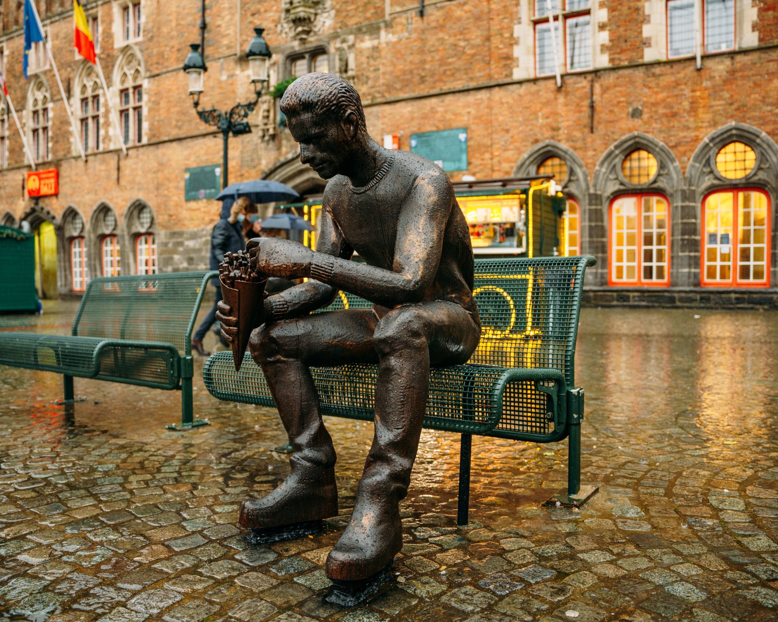 And so the chip shop and the taste and aroma of Belgian fries are deeply ingrained in the national streetscape. Indeed, this can be taken literally because at the foot of the Bruges Belfry, next to the two iconic chip shops and the monument of local folk heroes Jan Breydel and Pieter de Coninck, the De Frieteters statue portrays the joy of sampling fried potatoes the Belgian way.