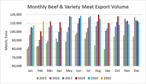 February beef exports to leading market Japan increased 24% from a year ago to 27,099 mt and climbed 20% in value to $171.4 million. Through February, exports exceeded last year’s pace by 10% in volume (52,304 mt) and 7% in value ($329.5 million).