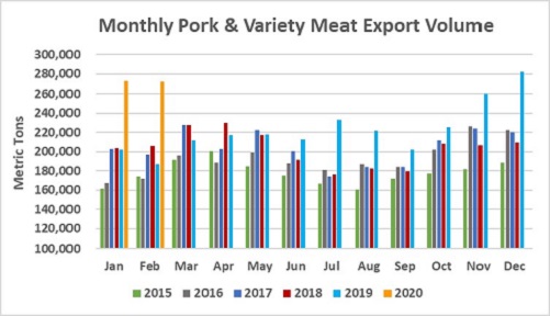 February exports to China/Hong Kong were even with the huge January volume and more than tripled from a year ago to 98,847 mt, while export value more than quadrupled to $243.2 million. For the first two months of 2020, exports increased 260% from a year ago to 195,849 mt and soared by 352% in value ($488.5 million).