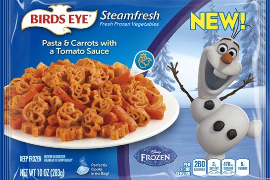 The parade of new products from Birds Eye features pastas in the shape of popular stars of fantasy animation including Anna, Elsa, and Olaf from Disney’s Frozen; Lightning McQueen and Mater from Disney-Pixar’s Cars; and classic Mickey Mouse and Minnie Mouse. Varieties offered, distributed in 283-gram Steamfresh bags bearing likenesses of the cartoon characters, include: whole grain pasta and corn with a butter sauce; pasta and broccoli with a cheese sauce; pasta and peas with a parmesan cheese sauce; and pasta and carrots with a tomato sauce.