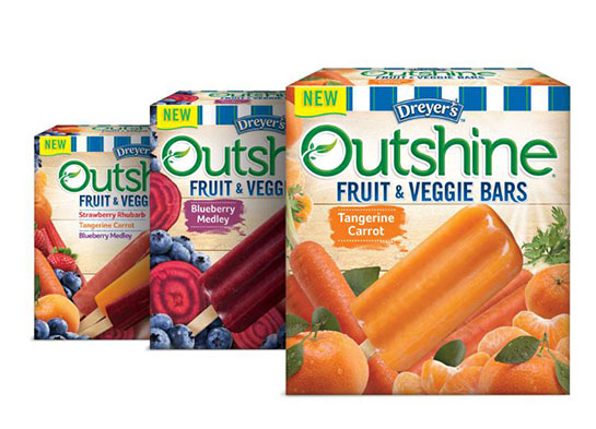 Dreyer’s Ice Cream Company’s Outshine fruit bars brand is launching the first national line of frozen fruit bars in the United States that combines fruit and vegetable ingredients. The range, called “Fruit and Veggie bars,” features five flavors: Blueberry Medley, Tangerine Carrot, Apple and Greens, Peach Mango Medley and Strawberry Rhubarb. The assortment also includes a 12-count multi-pack featuring Strawberry Rhubarb, Tangerine.