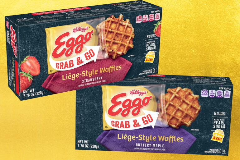 The Battle Creek, Michigan-headquartered Kellogg Company has launched Eggo Grab & Go Liege-Style Waffles in the United States, the first-ever Eggo waffle that doesn’t require a toaster for preparation. The bistro-quality handheld product, inspired by a classic Belgian street food staple, features a golden brioche dough that is baked through with crunchy bits of pearl sugar. Available in Buttery Maple and Strawberry flavors, the products are made with real butter and containin no artificial colors or flavors.