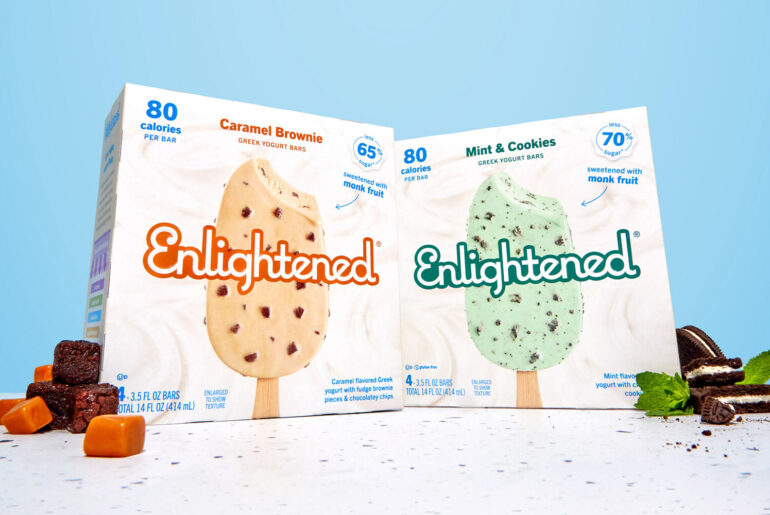 Enlightened Ice Cream has launched Frozen Greek Yogurt Bars. The new product line features in Caramel Brownie and Mint & Cookies flavors, both sweetened with monk fruit, distributed in four-packs priced at $6.99. They are now available at Sprouts Farmers Market, Harris-Teeter, ShopRite, Ingles, Smart & Final and other supermarkets and grocery stores in the USA.