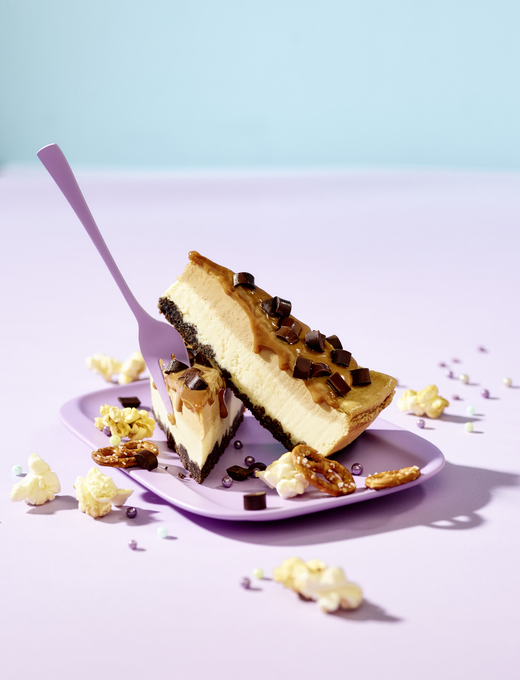 Cheesecake Salted Caramel brings together a crunchy, dark cocoa crumb base, a light and a caramel cheesecake layer and a salted caramel sauce as topping. Crunchy dark chocolate chips further enhance the flavor experience.