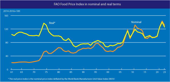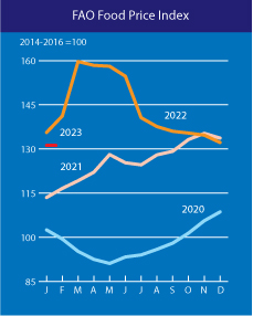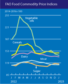 The United Nations FAO Food Price Index (FFPI), a measure of the monthly change in international prices of a basket of five food commodities, averaged 131.2 points in January 2023, down 1.1 points (0.8 percent) from December, marking the 10th consecutive monthly decline. With this latest decline, the benchmark index has fallen 28.6 points (17.9 percent) from the peak it reached in March 2022. The drop in the index last month was driven by declines in the price indices of vegetable oils, dairy and sugar, while those of cereals and meat remained largely stable.