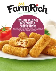 • Italian Sausage Mozzarella Cheese Sticks: Farm Rich levels up its iconic Mozzarella Stick with savory Italian sausage, gooey cheese and seasoned breading. Containing 12 grams of protein, the Italian Sausage Mozzarella Cheese Sticks are crispy, tasty and a hearty version of a fan favorite.