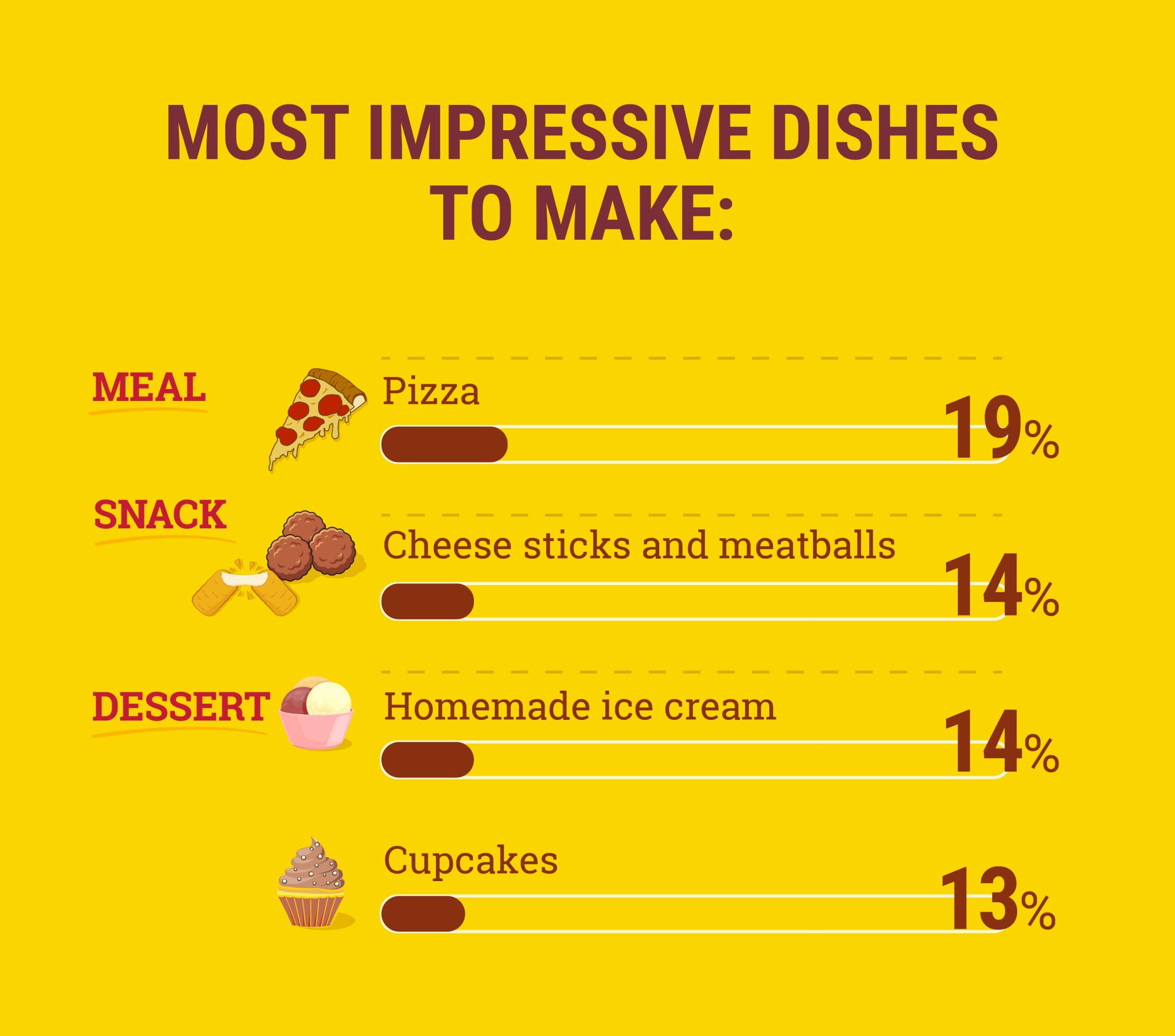 The top meal to cook for a lasting impression is pizza (19%), while cheese sticks and meatballs were tied for the most impressive snacks or appetizers to make (14% each). And if you want to indulge someone’s sweet tooth, you can’t go wrong with homemade ice cream (14%) or cupcakes (13%).