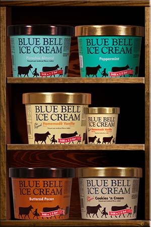 For now Blue Bell is producing the following flavors of ice cream: Buttered Pecan, Cookies ’n Cream, Dutch Chocolate, Homemade Vanilla, Peppermint, Pistachio Almond and The Great Divide. 12-pak Homemade Vanilla Cups and 12-pack Homemade Vanilla and Dutch Chocolate Cups are also available in stores.