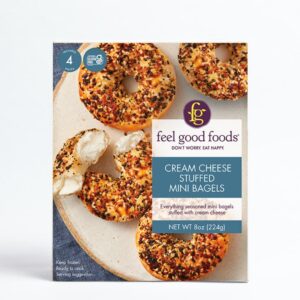The recalled Cream Cheese Stuffed Plain Mini Bagels with UPC 89903900283 and Cream Cheese Stuffed Everything Mini Bagels with UPC 89903900286 are packaged in cardboard cartons labeled with “Feel Good Foods” on the front panel and the bagel flavor listed below. The recall includes all Best By dates ranging from 5/29/24 to 9/17/25, which are located on the bottom of cartons.