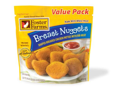 Foster Farms frozen cooked chicken product line includes Breast Nuggets, Hot ‘n’ Spicy Wings, Crispy Strips, Orange Chicken, Roasted Breast Chunks, Chicken Breast Grilled Strips, Buffalo Style Strips, Buffalo Breast Bites, Chicken Patties, Whole Grain Dinosaur Nuggets, Honey BBQ Glazed Wings, Chipotle Wings, Bourbon Chicken, Rotisserie Breast Fillets and Popcorn Chicken.