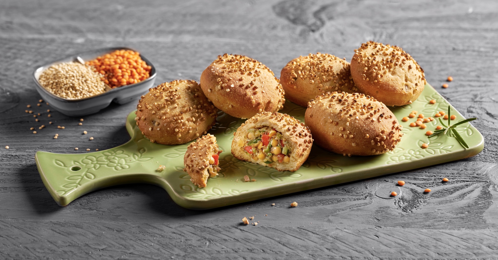 “V-Style” Buns (pictured below), described as “vegan meets Italian cuisine,” are easy-to-hold products are available in six flavors, including: Hummus & Olive (filled with hummus, olives and parsley); Spinach & Smoked Tofu (loaded with spinach and smoked tofu and then rounded off with a hint of garlic); Lentils & Grilled Vegetables (featuring a vegan composition of lentils and grilled vegetables, enhanced with a hint of garlic).