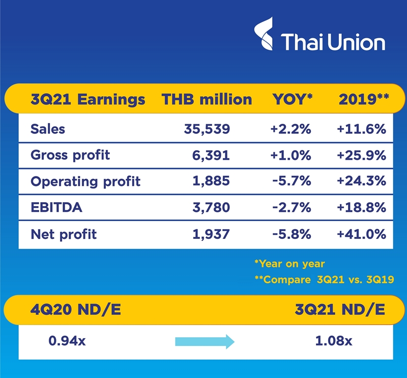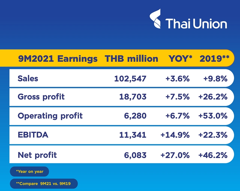 During the first three quarters of 2021, the seafood producer and marketer rang up total sales of THB 102.5 billion, an increase of 3.6 percent year-on-year, with net profit 27 percent higher at THB 6 billion year-on-year.