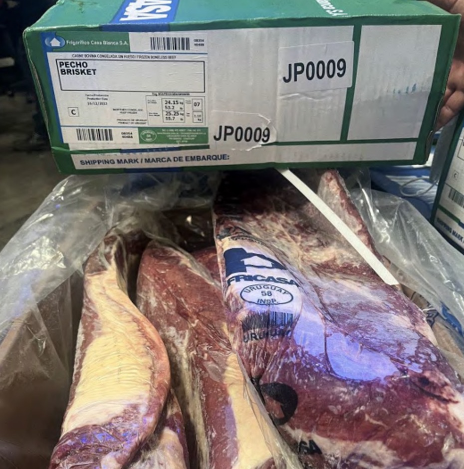 • Various weight cardboard cases labeled as “Frigorífico Casa Blanca S.A. PECHO BRISKET” with case code JP0009 containing individually vacuum sealed products displaying “FRICASA.”