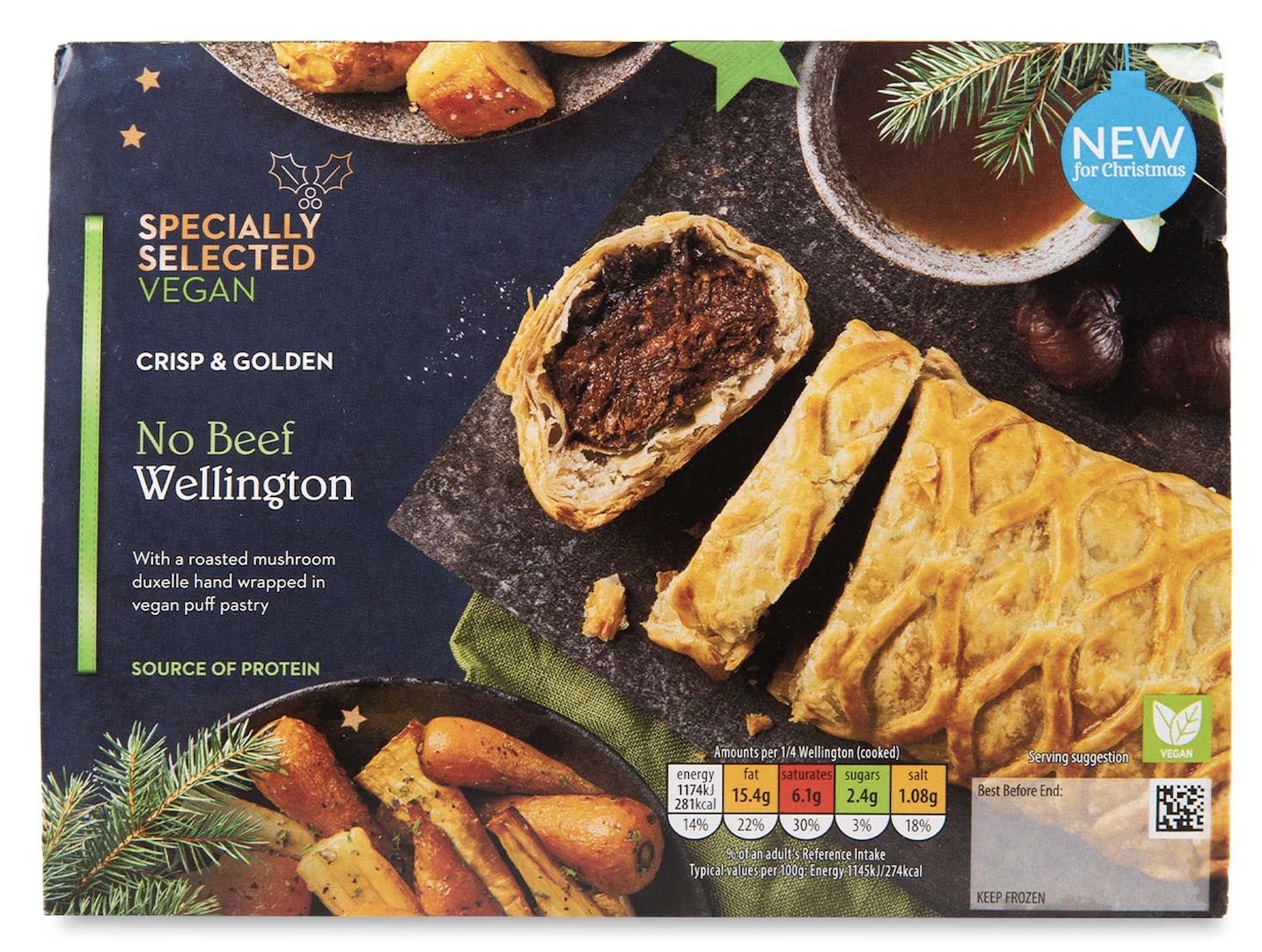 Aldi hasn’t forgotten those who are looking for indulgent plant-based options this season, selling a Specially Selected No Beef Wellington (£4.99, 450g), consisting of a soya-based beef inspired core, topped with a creamy mushroom duxelle and wrapped in light and flaky vegan lattice pastry.