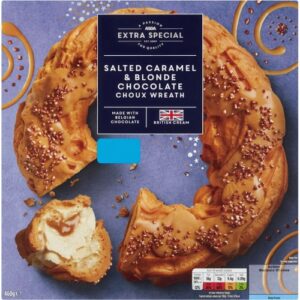 ASDA’s Extra Special Salted Caramel and Blonde Chocolate Choux Wreath (£5.50) is a sweet and edible nod to the traditional Christmas decoration. Prepared with smooth Belgian chocolate, the wreath is made with salted caramel cream and sauce and sprinkled with a sugar crunch.