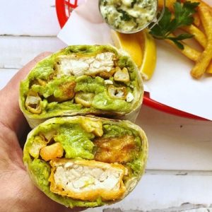•Fishless Fish and Chips Burrito with Gardein Fishless Filets and Creamy Pea Puree and Tartar Sauce (pictured below)