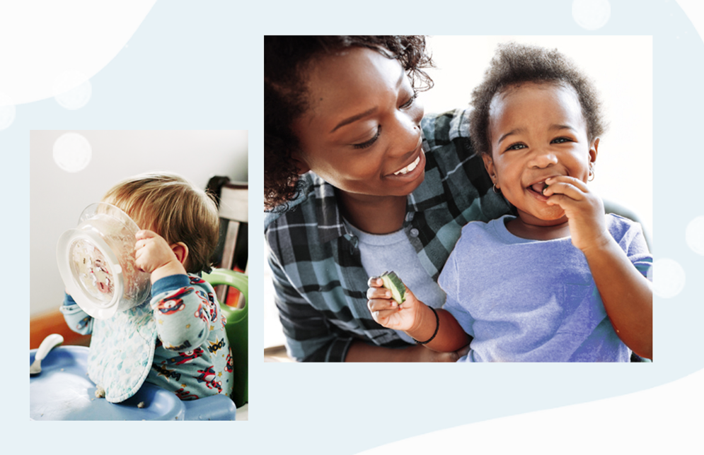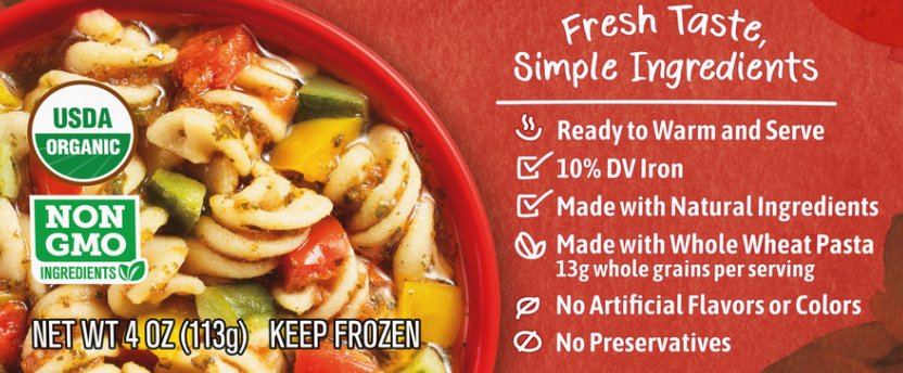 - Organic Veggie & Grain Bowl – Tomato Basil. Containing 10% daily value of iron and whole grain pasta, this is an easy-to-self-feed option for toddlers. The bowl contains a variety of colorful vegetables, including tomatoes, yellow bell peppers, zucchini and kale.