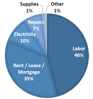 The CCI includes five classes of expenses: labor, electric power, rent, supplies, and repairs. The cost shares typical of a North American refrigerated warehouse (as detailed in the pie chart below) show that labor was the largest share of expenses, at 46% of the total.