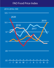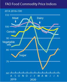 The Meat Price Index was also almost unchanged since July – although down 8.9 percent from August 2019 – as the effect of lower import demand for bovine, poultry and ovine meats was offset by surging import demand for pig meat from China.