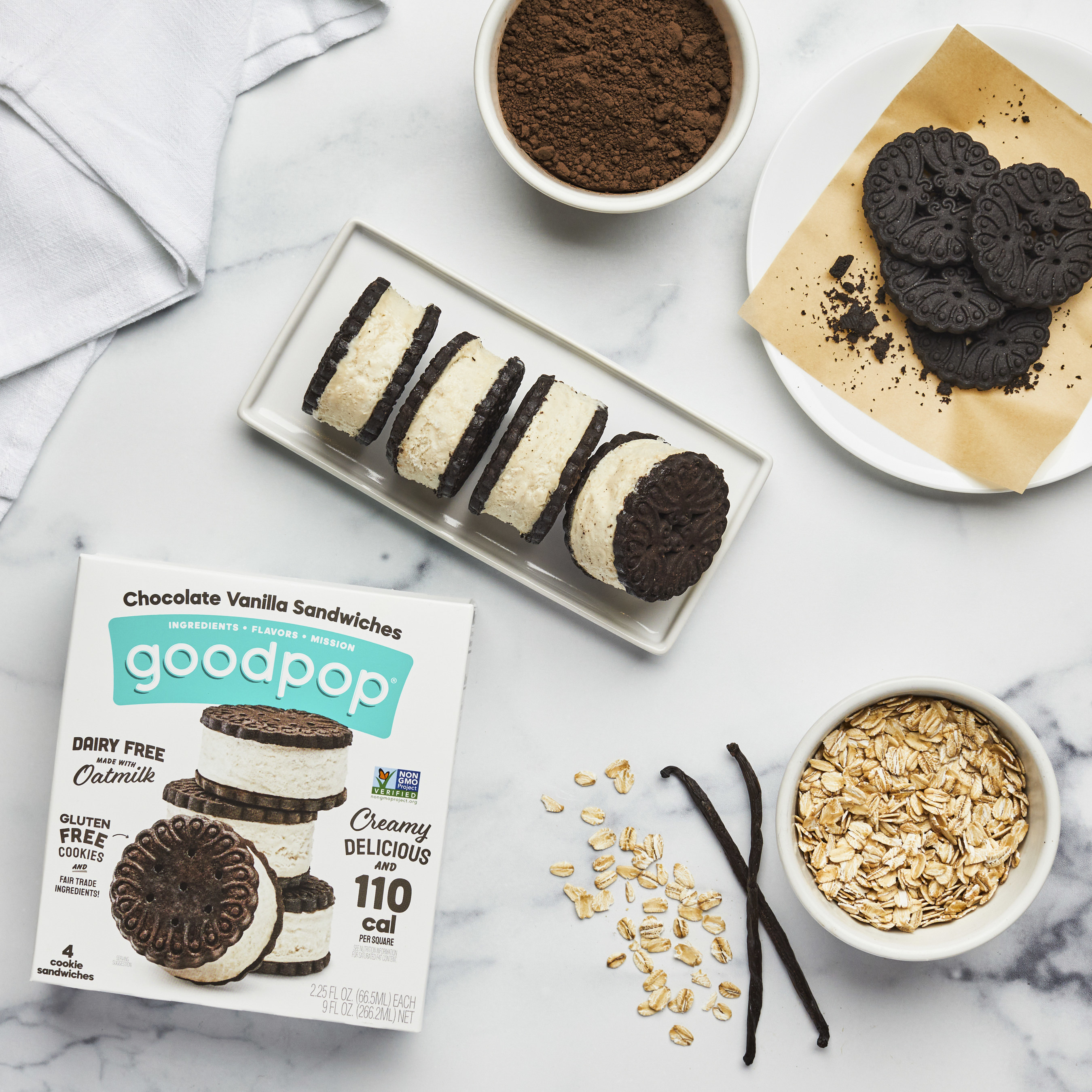 At 110 calories each with only eight grams of sugar content, GoodPop’s Chocolate Vanilla Sandwiches are the first gluten-free, oatmilk frozen dessert sandwich on the market that is 100% plant-based and gluten-free. The product is also kosher, and made with only fair trade, non-GMO ingredients.