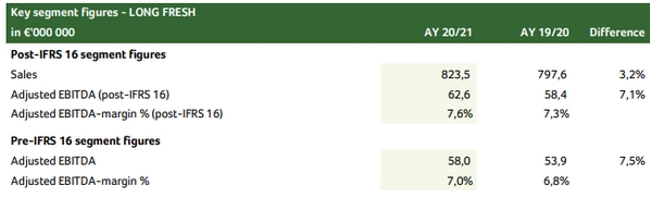 •Long Fresh: the adjusted EBITDA (post-IFRS 16) amounted to €62.6m for AY 20/21 versus €58.4m last year (+7,1%). The further growth is the result of a relentless focus on efficiency improvements, a positive impact of new sales and purchase contracts and an increasing share of sales in higher-end products (higher margin convenience and fruit representing around 30% of Long Fresh sales).