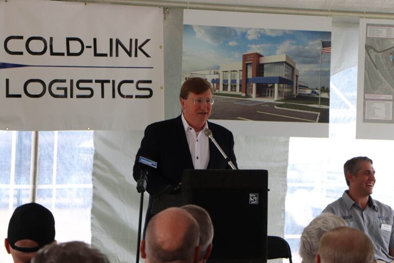 Mississippi Governor Tate Reeves joined with members of the Cold-Link Logistics team and design-build specialist Tippmann Group as a speaker (pictured above) following a groundbreaking event on July 13 to ceremoniously kick construction of a 198,000-square-foot cold storage facility in Ellisville. Scheduled to open in the summer of 2024 and bring 84 new jobs to Jones County, the state-of-the-art warehouse will provide nearly 27,000 pallet positions for frozen and refrigerated food products.