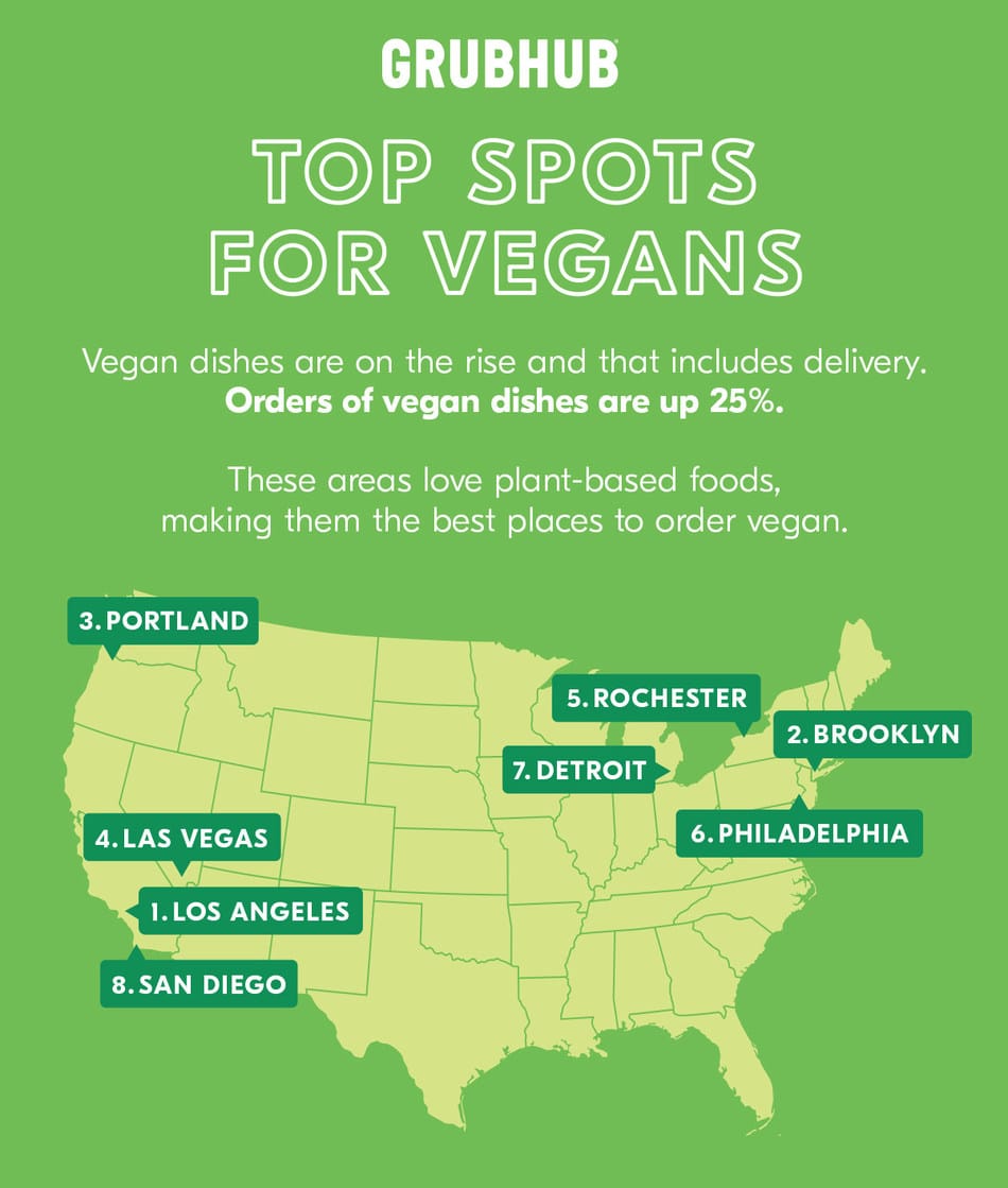 In determining the top places for vegans, Grubhub evaluated a variety of factors using data available through its platform, including the number of vegan restaurants, ratings, order volume and overall number of vegan items available on Grubhub in each respective city as compared to the rest of the country.