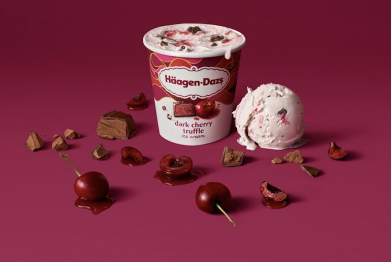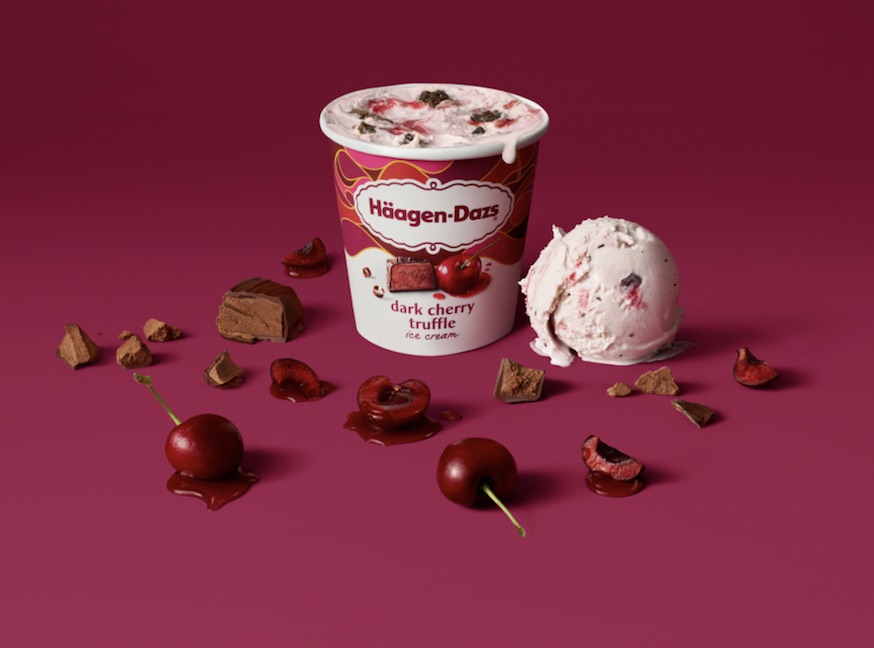 A new suite of ice cream products has been iunveiled by Häagen-Dazs. Anchored by Dark Cherry Truffle flavor and Cherry Dark Chocolate bars, the range includes Coffee Almond Toffee and Peanut Butter Brittle 14-ounce cartons, Toasted Coconut Crunch ice cream bars and Dulce De Leche mini bars.