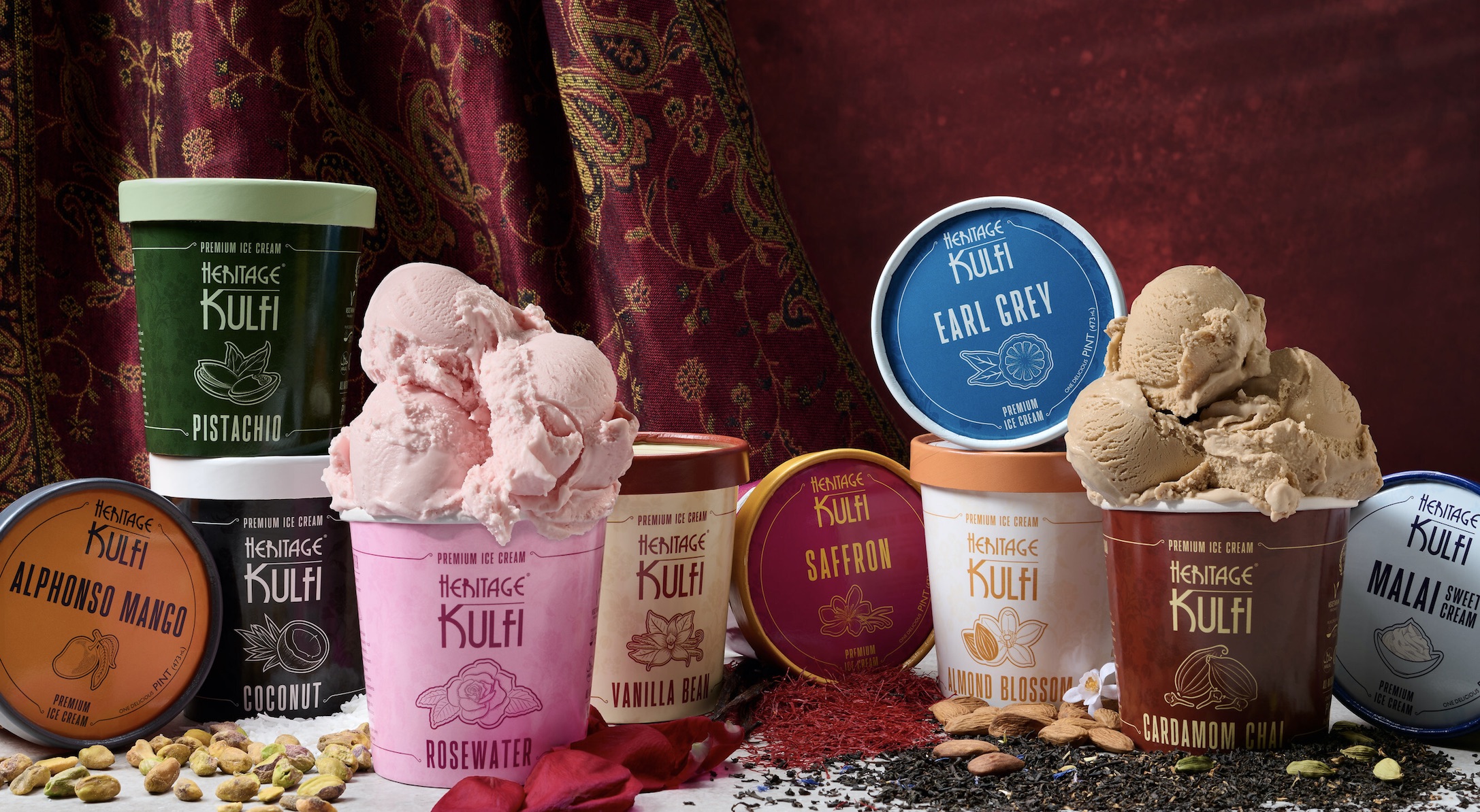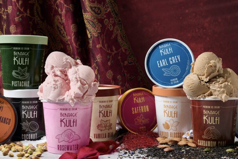 Heritage Kulfi offers a luxurious take on classic ice cream with flavors, textures and aromas derived from saffron, rosewater, pistachio, cardamom chai, alphonso mango, coconut, Earl Grey, vanilla bean, malai sweet cream and almond blossom.
