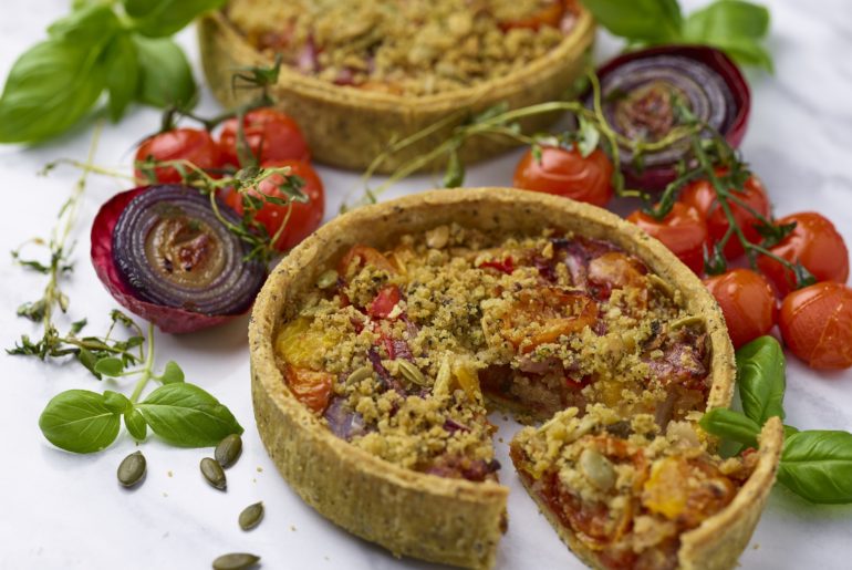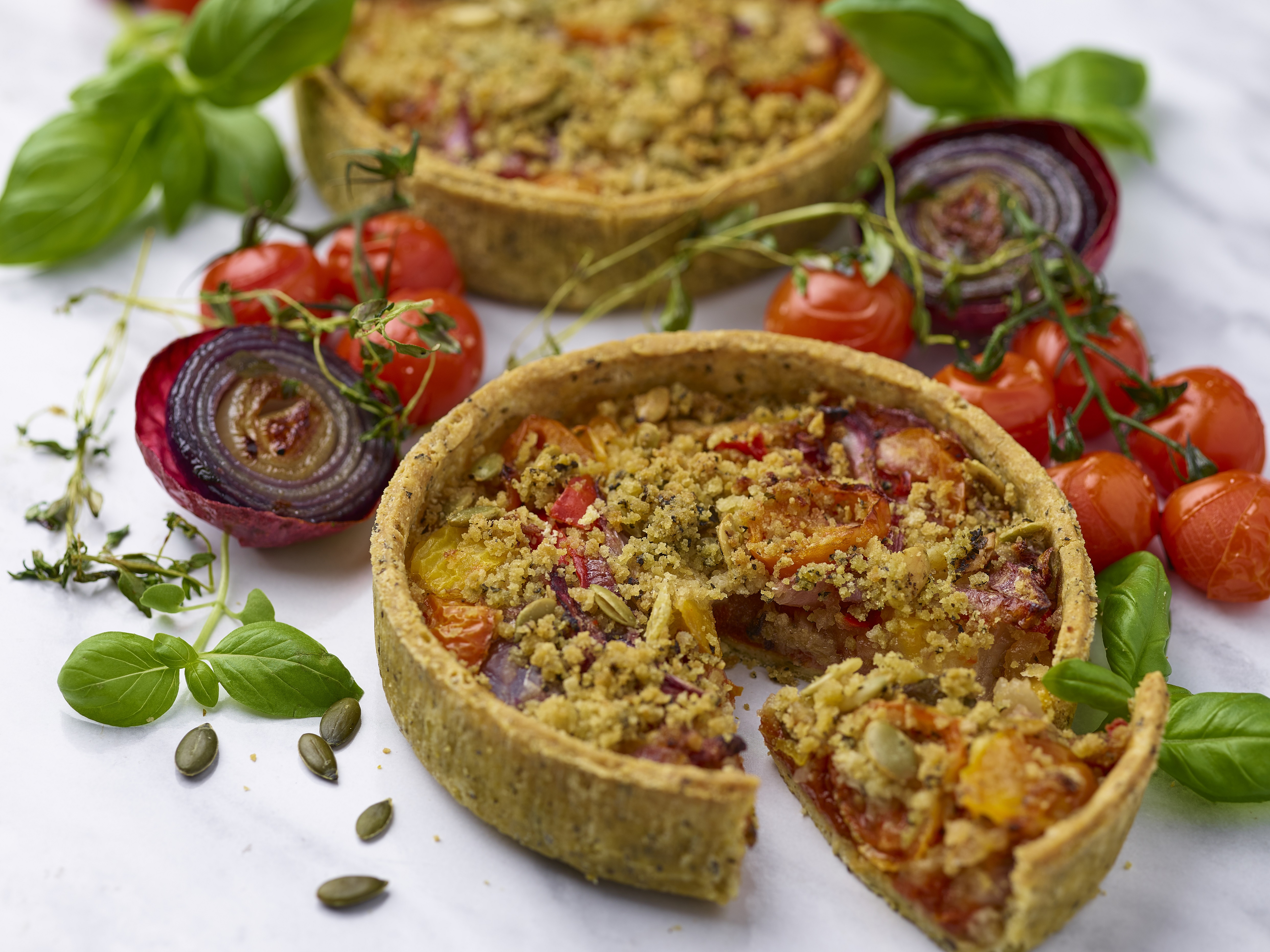 The Menuserve Mediterranean Vegetable Tart is a ready-to-bake, crisp basil pastry case filled with a slow roasted tomato sauce topped with grilled courgettes, red and yellow peppers, red onions and cherry tomatoes, all finished with a crunchy basil and pumpkin seed crumb.