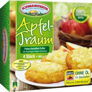 A new frozen product from Germany’s Schwarmstedter potato specialist puts a crown of applesauce on a potato dumpling. The Apfel-Traum, without artificial additives, can be quickly prepared in the oven without oil, and goes nicely with vanilla ice cream or vanilla sauce. Four dumplings come per 300-gram box, which recommended for retail at EUR 1.99.